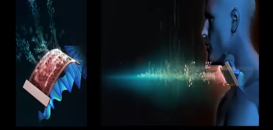 陶璐琪教授团队利用多孔石墨烯材料的优势,研发出一种收发同体、适合穿戴的集成声学器件。这种集成声学器件,利用石墨烯的热声效应来发射声音,利用石墨烯的压阻效应来接收声音,实现了单器件的声音收发同体。器件使用的多孔石墨烯材料具有高热导率和低热容率的特点,能够通过热声效应发出100Hz-40kHz的宽频谱声音。其多孔结构对压力也极为敏感,能够感知发声时喉咙处的微弱振动,通过压阻效应接收声音信号。因此,这种器件能够准确感知聋哑人低吟、尖叫等特殊声音,并将这种“无含义声音”转换为频率、强度可控的声音,有望在将来转换为预先录制的语言。