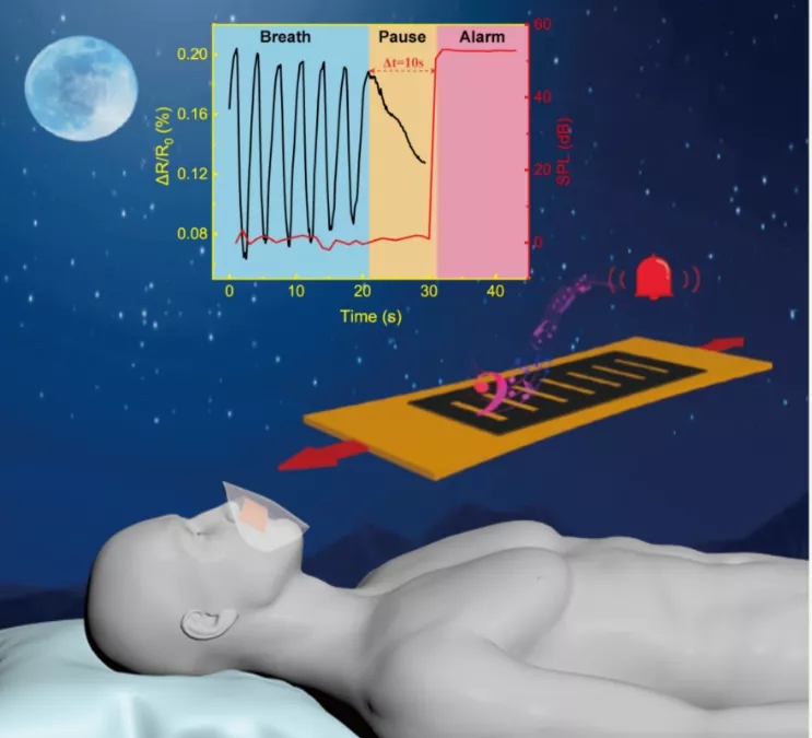 近年来,纳米材料的高速发展为健康监测提供了新的技术手段,石墨烯、碳纳米管等材料被广泛应用于心率、呼吸等健康参数的监测。然而现有监测技术主要通过电阻或电容等电学信号的变化来反应力学信号的变化,虽然其灵敏度很高,但仍需要借助外部设备而无法实现自身报警。因此,开发一款集检测和报警功能于一体的电子器件,是一项极具启发性和挑战性的工作。