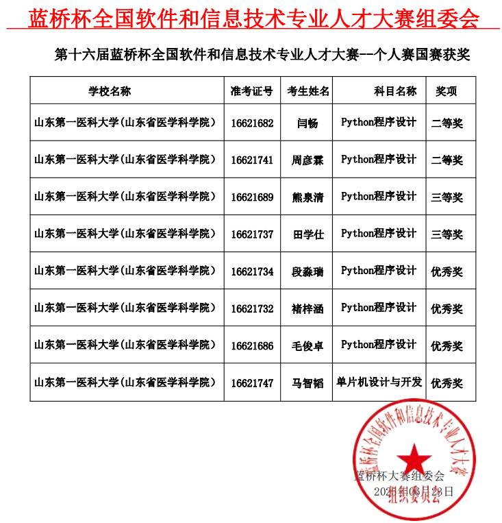 2025年6月15日,第十六届蓝桥杯全国软件和信息技术专业人才大赛个人赛全国总决赛在山东理工大学等全国58所高校同步举办。公司beats365唯一官网入口官网学子在比赛中表现优异,荣获二等奖两项、三等奖两项和优秀奖四项的佳绩。