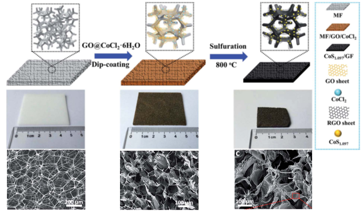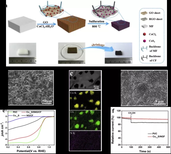 由于对再生资源的迫切需求,氧还原反应(ORR)得到了广泛的研究。寻找高效、低成本的非贵金属催化剂越来越重要。 李晨蔚教授团队以三聚氰胺泡沫为模板,采用简单的渗透-干燥-硫化法制备了均匀分布硫化钴纳米颗粒的多孔硫氮共掺杂石墨烯/碳泡沫(Co1-xS/SNG/CF)(如下图)。其中,三聚氰胺泡沫不仅可以作为三维支撑骨架,还可作为没有任何环境污染的氮源。研究发现,Co1-xS/SNG/CF催化剂表现出优异的氧还原催化性能,起始电势仅为0.99 V,与Pt/C催化剂相同(Eonset=0.99 V),且Co1-xS/SNG/CF的稳定性和甲醇容限比Pt/C催化剂更为突出。 该项工作提供了一种简便的方法制备Co1-xS纳米颗粒修饰的S和N共掺杂3D石墨烯网络,有望作为价格昂贵的Pt/C催化剂的替代品用于高效氧还原反应中。