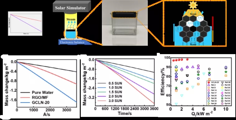 太阳能驱动的蒸汽产生技术是目前最有前途的海水淡化技术之一,受到了广泛的关注。然而,如何实现低成本、易于制造、蒸发效率高、机械性能和耐久性良好的太阳能驱动蒸汽产生装置仍然是一个重大挑战。 李晨蔚教授团队提出一种以三聚氰胺泡沫(MF)为模板,引入氧化石墨烯,在只需10min的还原干燥条件下就可快速制备具有开口和闭口结构的石墨烯/纤维素纳米晶复合气凝胶(GCLN)(如下图)。该制备方法既简单又经济。其中,复合气凝胶中的开口结构有利于水的传输和蒸汽逃逸,闭口结构则益于水的蒸发。由于石墨烯优异的光吸收性能和纤维素纳米晶优异的亲水性能,GCLN在1 kW m−2太阳辐射下的蒸发速率为1.66 kg m−2 h−1,蒸发效率可达97.5%。此外,GCLN在一系列恶劣条件和耐久性试验中仍能保持良好的结构稳定性和蒸发性能。源于MF良好的加工性能,进一步制备了具体立体结构的GCLN。 研究发现:在相同的投影面积下,立体结构的GCLN比平面结构的GCLN具有更高的光热转换速率。这项工作为在自然阳光条件下开发低成本、大规模海水淡化的太阳能蒸汽产生装置提供了一条新的途径。