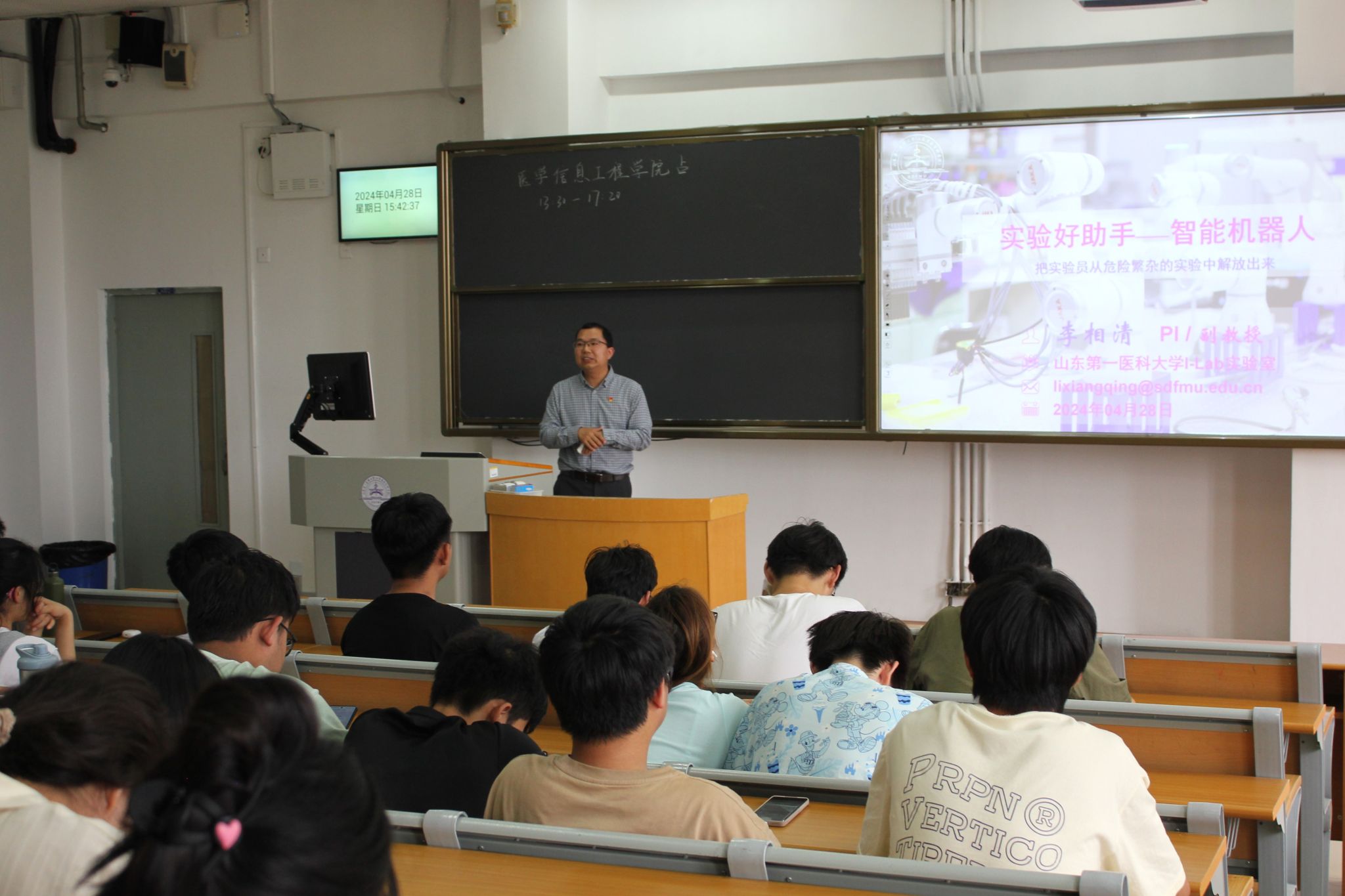 支部书记李相清向同学们介绍了校(院)开展“领航工程”的重要意义、下一步的活动计划和公司基本情况。随后,李相清为全体2023级智能医学工程专业同学,做题为《实验好助手--智能机器人》的学术报告。向同学们介绍了面向全实验室自动化(TLA)系统创新设计、关键技术及落地应用研究的“机器人+AI+医学”的前沿交叉技术,为智能医学工程专业同学扩展了科研创新视野,巩固了专业思想。