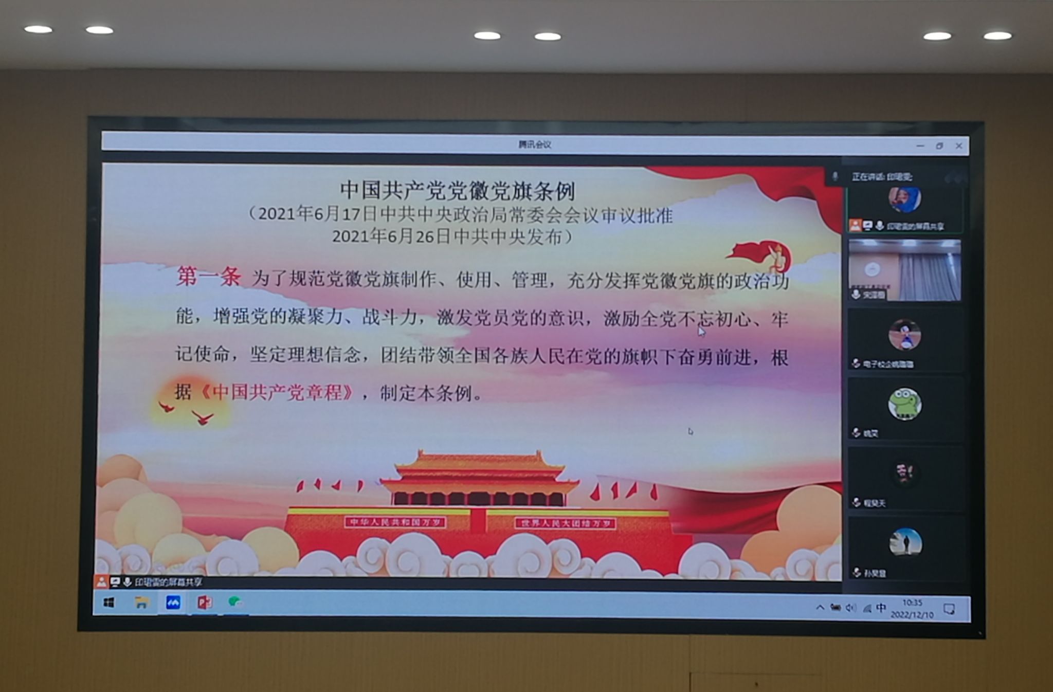 随后,公司员工第二党支部书记印珺雯做了《学习贯彻<中国共产党党徽党旗条例>,自觉维护党徽党旗尊严》主题党课,就中国共产党党徽党旗标准、尺度、使用规范等相关知识进行传达。强调,中国共产党的党徽党旗是中国共产党的象征和标志,全体党员应切实学习本条例,自觉维护党徽党旗尊严。