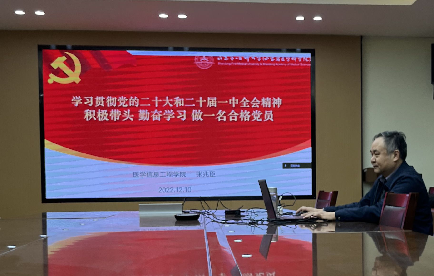 为深入学习贯彻党的二十大和二十届一中全会精神,12月10日,医学信息工程公司党委书记张兆臣为公司员工党员、入党积极分子讲授主题为《学习贯彻党的二十大和二十届一中全会精神,积极带头,勤奋学习,做合格党员》的专题党课,党委副书记梁莉芃、全体辅导员同时参学。